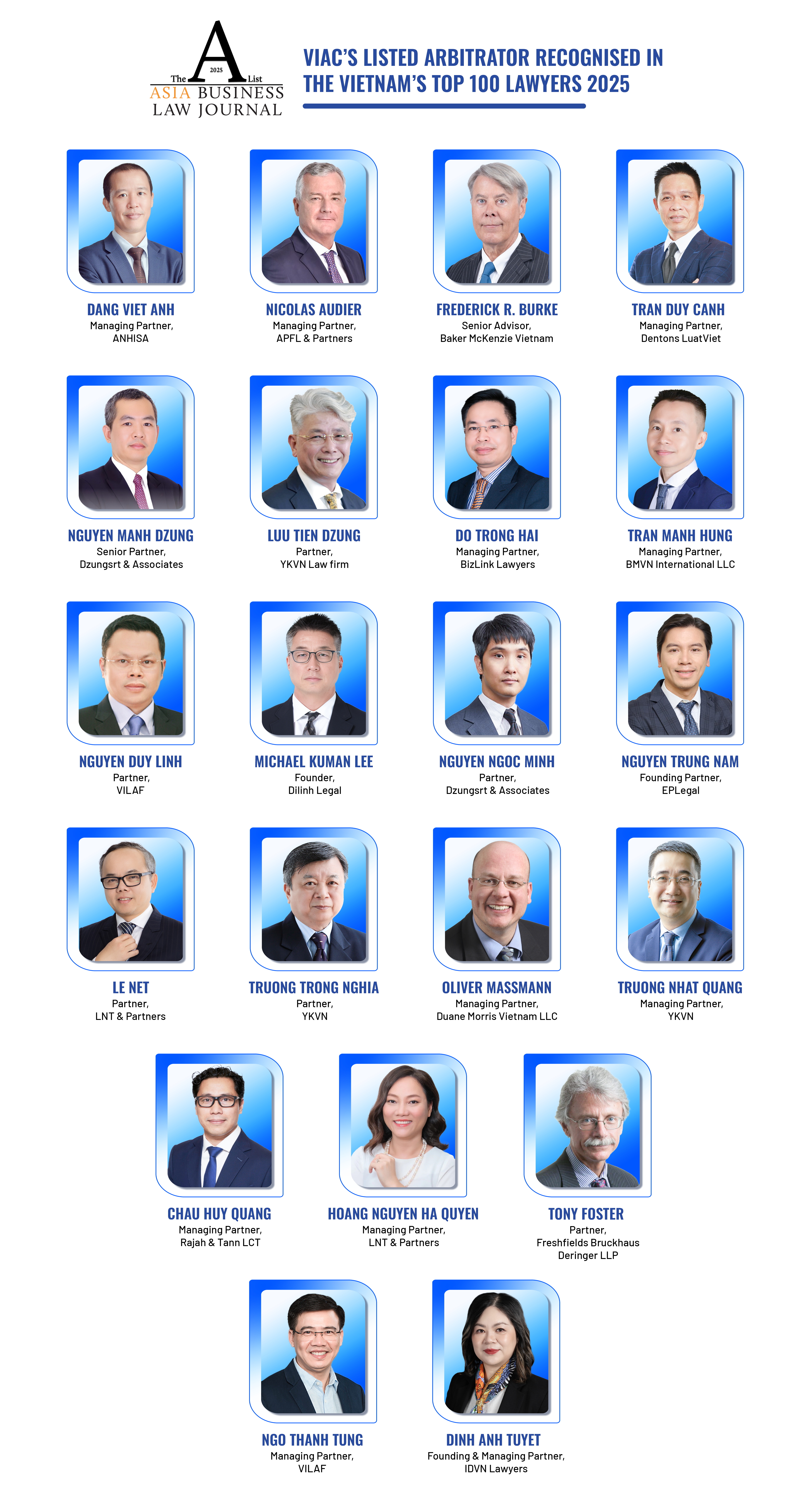 The list includes 21 Listed Arbitrators of the Vietnam International Arbitration Centre (VIAC) and Listed Mediators of Vietnam Mediation Centre (VMC) – a division of VIAC, namely: