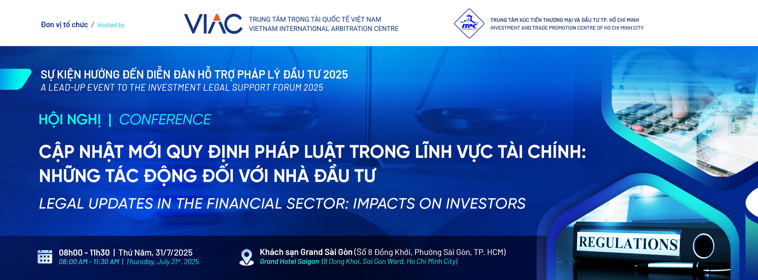 The legal framework in the fields of finance and taxation is undergoing significant changes, with the purpose of creating a transparent business environment, promoting fair competition, and protecting investors’ rights. With the objective of equipping enterprises and investors with timely access to new legal regulations and enabling them to develop appropriate responses to emerging opportunities and challenges, the Vietnam International Arbitration Centre (VIAC), in coordination with the Ho Chi Minh City Investment and Trade Promotion Centre (ITPC), is organizing the Conference “Legal updates in the financial sector: Impacts on investors".