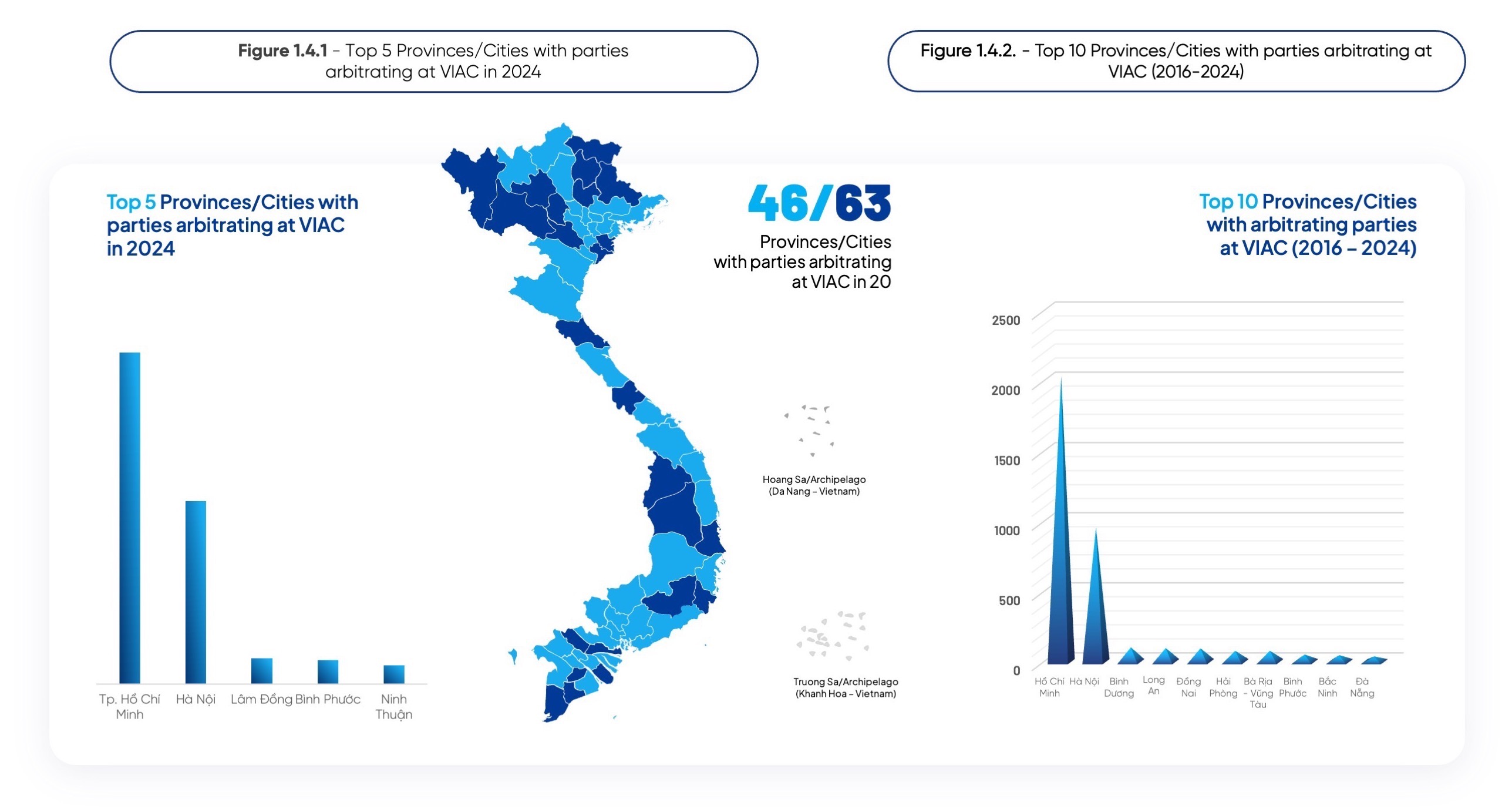 In 2024, Ho Chi Minh City and Hanoi are the 02 (two) cities with the highest number of new cases filed and handled by VIAC. In addition, VIAC handled cases involving parties from 46 provinces/cities across Vietnam, along the top 05 (five) provinces/cities with the highest number of disputing parties being Ho Chi Minh City, Hanoi, Lam Dong, Binh Phuoc, and Ninh Thuan.