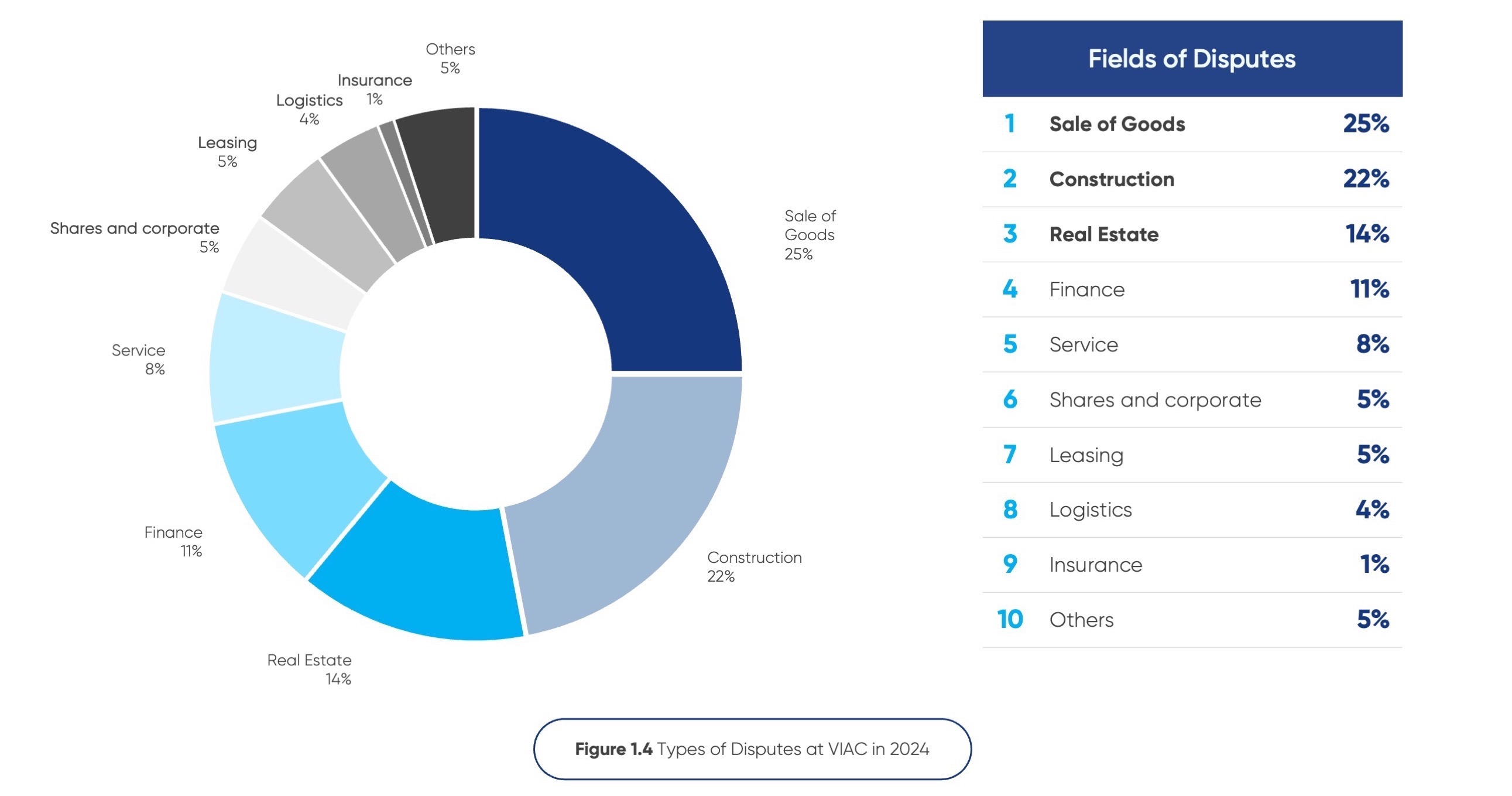 In the past year, VIAC handled 478 cases, marking another record-breaking year in terms of the number of cases accepted and resolved in VIAC’s over 30 years of operation. The largest proportion of disputes arose from the sale of goods (25%), followed by construction (22%) and real estate business (14%).