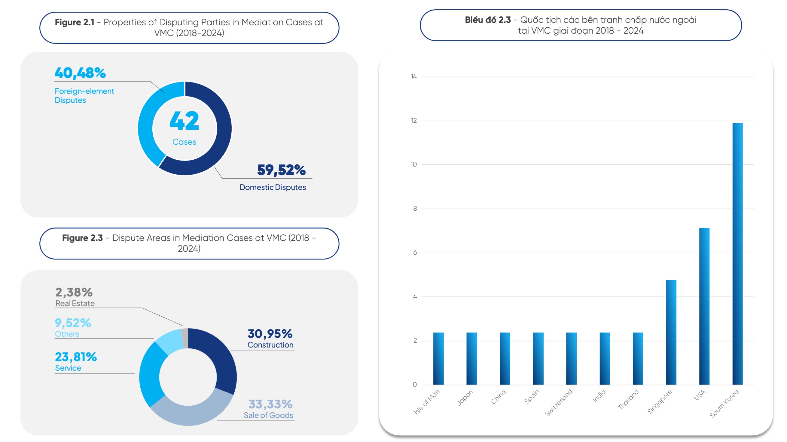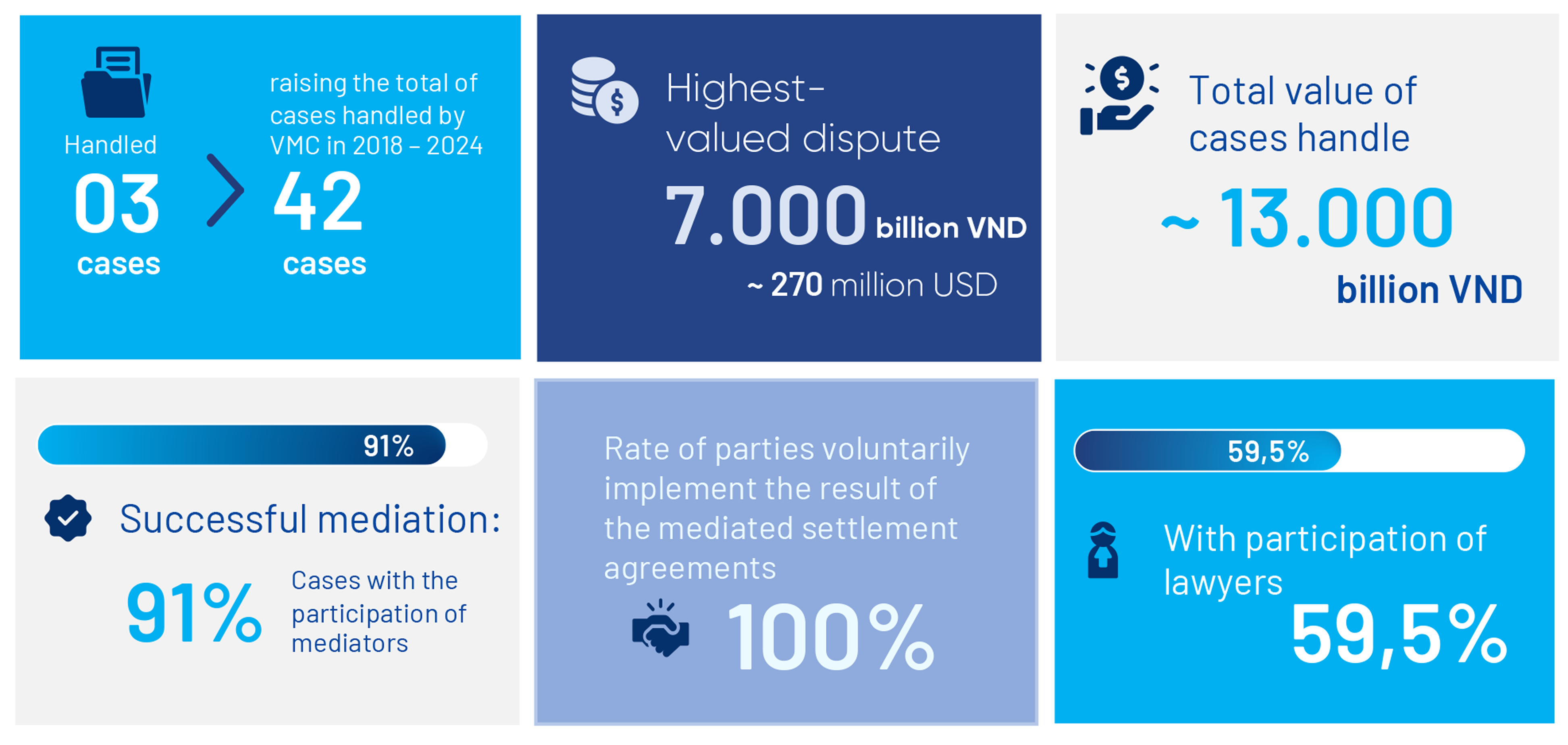 In 2024, the Vietnam Mediation Center (VMC) under VIAC received 03 cases, raising the total of cases handled by VMC between 2018 and 2024 to 42, with 59,52% being domestic disputes and 40,48% involving foreign elements.