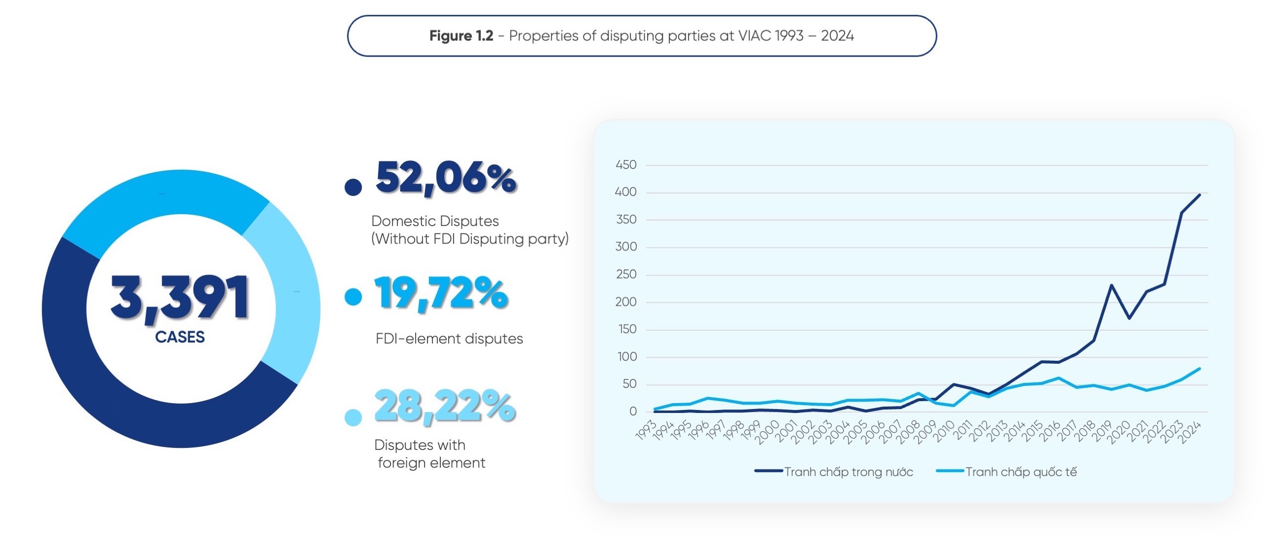 From 1993 to 2024, VIAC has handled 3,391 cases in which the proportion of domestic disputes is 52,06%, disputes with at least one FDI enterprise account for 19,72%, and disputes with foreign elements constitute 28,22%.