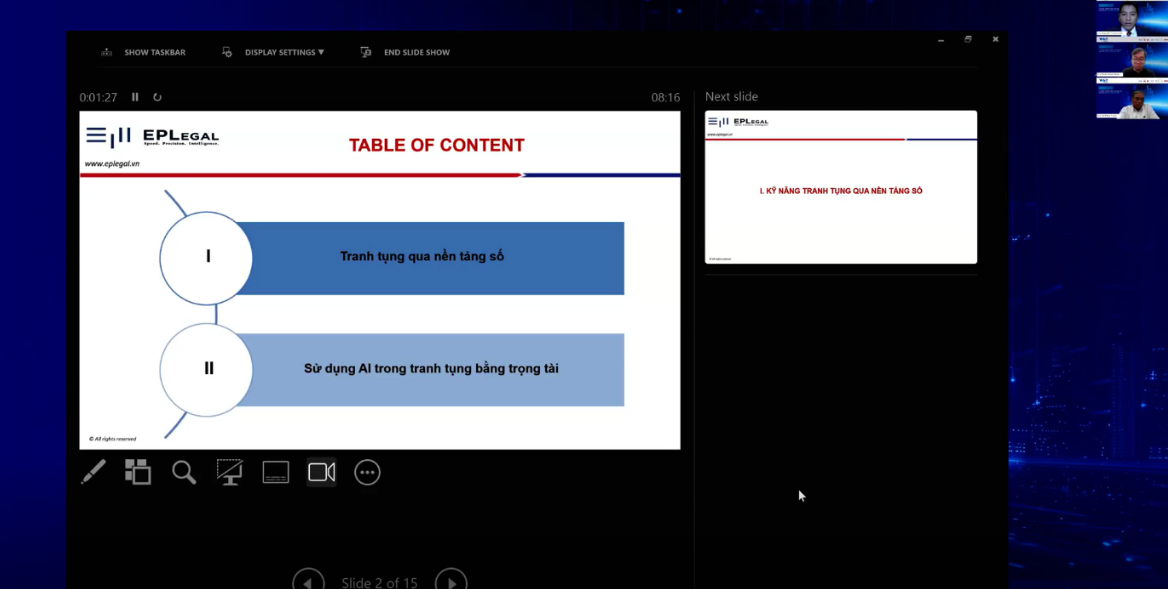 Dẫn đề, Ls. Nguyễn Trung Nam đã chia sẻ những phân tích quan trọng về kỹ năng tranh tụng trong thời đại số, tập trung vào hai nội dung then chốt: tranh tụng qua nền tảng số và ứng dụng trí tuệ nhân tạo (AI) trong tố tụng trọng tài. Ông nhấn mạnh rằng việc số hóa đã thay đổi căn bản cách thức tiến hành tố tụng. Luật sư ngày nay không chỉ nộp đơn và quản lý hồ sơ trực tuyến, tham gia phiên họp và xét xử từ xa, mà còn phải sử dụng chứng cứ điện tử và quen với việc phán quyết được ban hành dưới dạng điện tử. Điều này đòi hỏi luật sư cần thành thạo kỹ năng công nghệ, quản lý tài liệu số, trình bày và phản biện chứng cứ trực tuyến, cũng như giao tiếp chuyên nghiệp trong môi trường trực tuyến vốn hạn chế về tương tác. Bên cạnh đó, Ls. Nam phân tích vai trò ngày càng lớn của AI trong hoạt động giải quyết tranh chấp. AI giúp xử lý dữ liệu phức tạp, tiết kiệm thời gian, chi phí và gợi ý chiến lược tranh tụng. Tuy nhiên, ông lưu ý AI chỉ là công cụ hỗ trợ, quyết định cuối cùng vẫn thuộc về con người để bảo đảm công bằng tố tụng. Do đó, luật sư cần chủ động rèn luyện tư duy phản biện và thận trọng khi khai thác AI, tránh sự phụ thuộc quá mức.