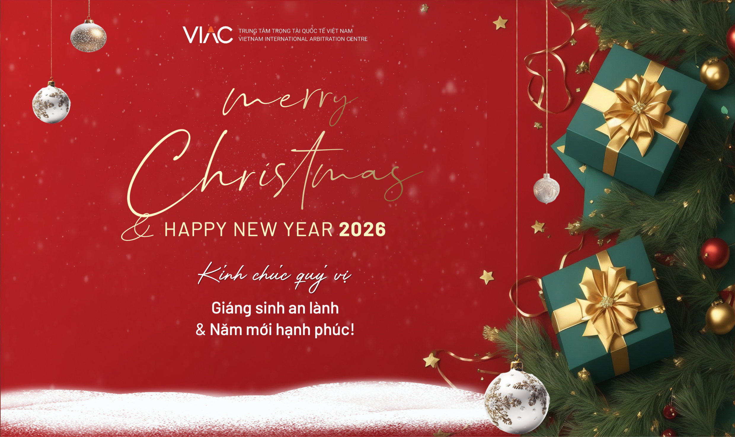 Trung tâm Trọng tài Quốc tế Việt Nam (VIAC) trân trọng gửi lời tới quý vị lời cảm ơn vì đã luôn tin tưởng, gắn bó và ủng hộ chúng tôi trong năm 2025. VIAC kính chúc quý vị một mùa Giáng sinh ấm áp, một năm mới nhiều sức khỏe, nhiều niềm vui và đạt được nhiều kết quả tốt đẹp trong công việc và cuộc sống.