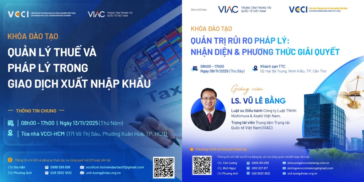 Nhằm làm rõ và cung cấp bức tranh về những diễn biến mới trong hoạt động ngoại thương cho doanh nghiệp, Liên đoàn Thương mại và Công nghiệp Việt Nam - Chi nhánh Khu vực Thành phố Hồ Chí Minh (VCCI-HCM) và Trung tâm Trọng tài Quốc tế Việt Nam (VIAC) triển khai Khóa đào tạo với chủ đề "Quản lý thuế và pháp lý trong giao dịch xuất nhập khẩu". Tại Khóa đào tạo, những thông tin cập nhật về thuế, các chính sách thương mại quốc tế cũng như những rủi ro pháp lý mới trong quá trình giao kết và thực hiện hợp đồng sẽ được trao đổi. Khóa đào tạo diễn ra từ 08:00 đến 17:00 ngày 13 tháng 11 năm 2025. [Xem thêm]