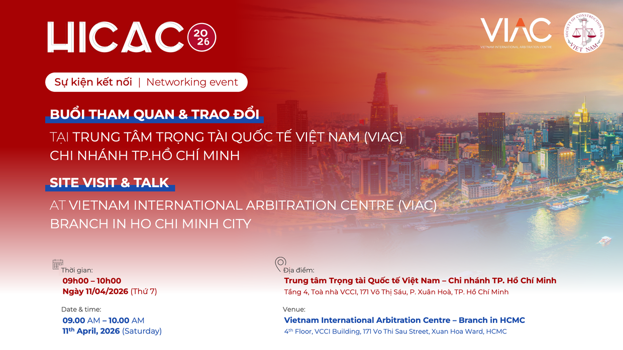 Trong khuôn khổ Hội thảo Trọng tài Xây dựng Quốc tế TP. Hồ Chí Minh 2026 (HICAC 2026), nhằm mở rộng cơ hội kết nối, tăng cường trao đổi chuyên môn giữa các chuyên gia, tổ chức và doanh nghiệp trong lĩnh vực xây dựng - giải quyết tranh chấp, Ban Tổ chức trân trọng kính mời Quý Đại biểu tham dự Buổi tham quan & trao đổi tại Trung tâm Trọng tài Quốc tế Việt Nam (VIAC) – Chi nhánh TP. Hồ Chí Minh.