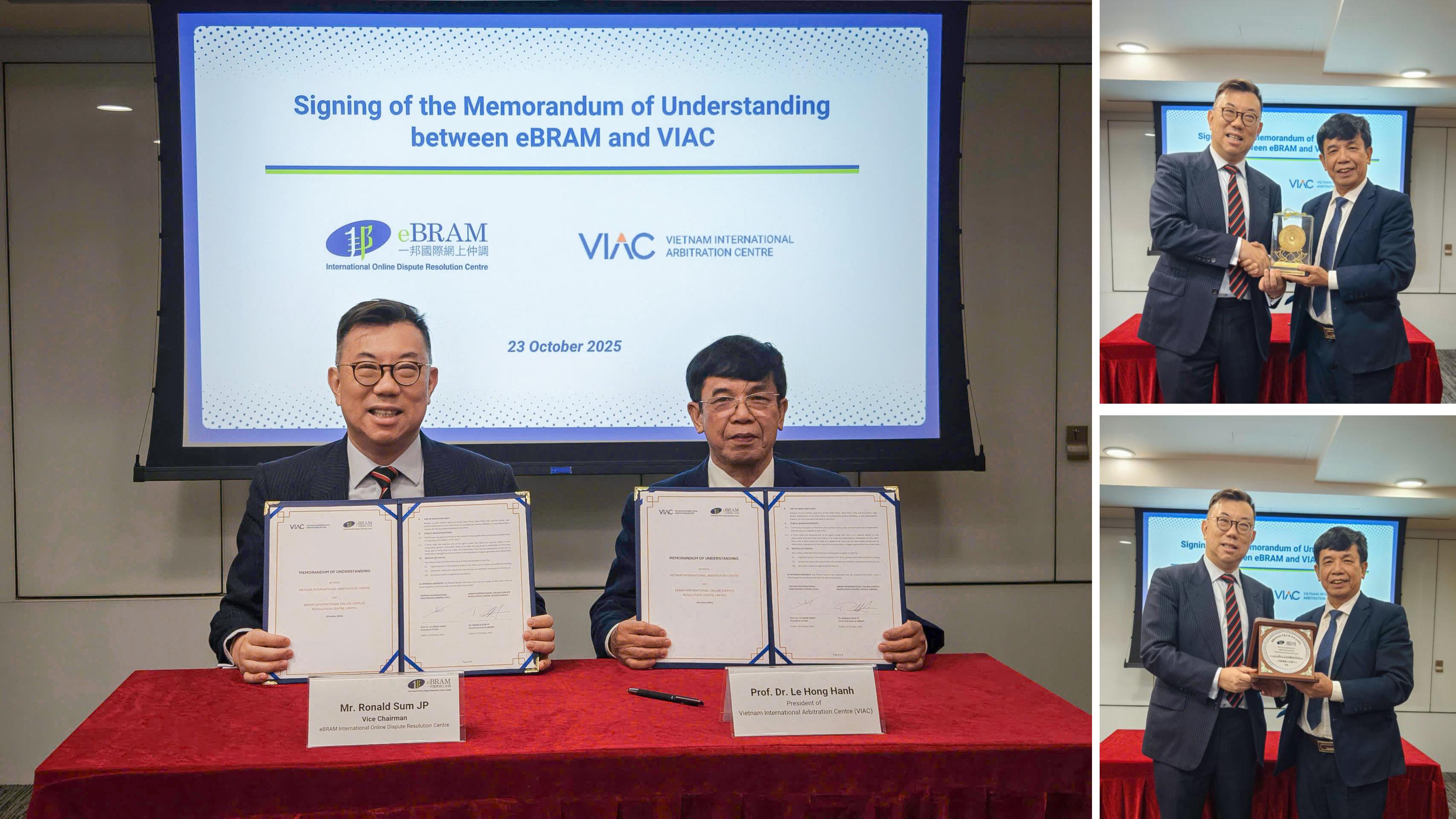 Từ ngày 21 đến 24/10/205, Đoàn công tác của Trung tâm Trọng tài Quốc tế Việt Nam (VIAC) đã có chuyến thăm và làm việc tại Hồng Kông. Trong khuôn khổ chuyến đi, vào sáng ngày 23/10/2025, Đoàn đã có buổi làm việc với Trung tâm Giải quyết Tranh chấp Trực tuyến Quốc tế eBRAM (eBRAM) và thực hiện lễ ký kết thỏa thuận hợp tác giữa hai bên.