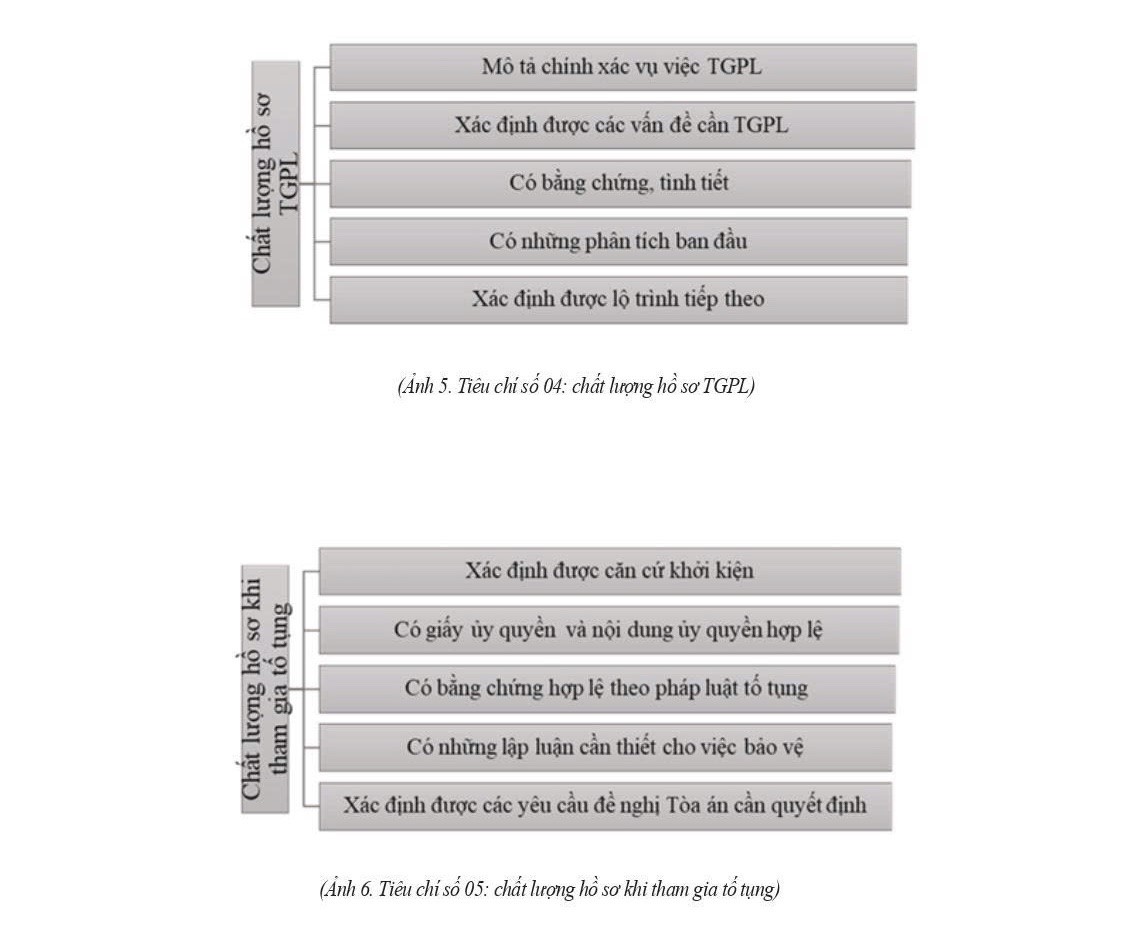 - Tiêu chí số 05 và chỉ số. Trong trường hợp vụ việc tư vấn cần trải qua tố tụng tư pháp, việc chuẩn bị hồ sơ đáp ứng các yêu cầu gồm phân tích, lập luận sâu sắc, đúng với pháp luật mang lại kết quả tốt cho hoạt động TGPL tại phiên tòa. Trường hợp Tòa án không mang lại công lý cho người được TGPL vì những lý do ngoài sự kiểm soát của người TGPL thì hồ sơ tố tụng được chuẩn bị tốt thể hiện rõ chất lượng hoạt động TGPL (xem ảnh 6 trang 12).