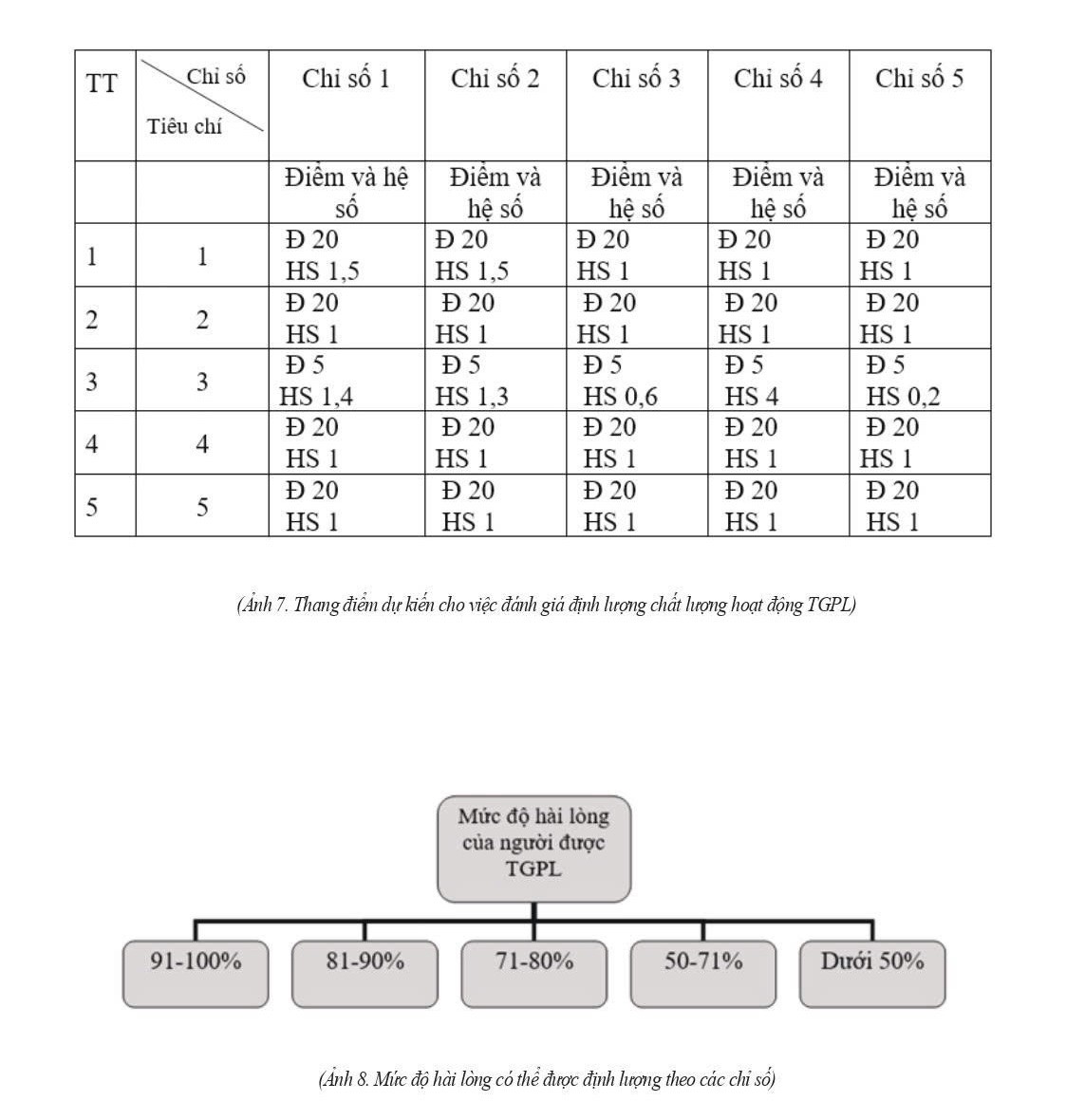 “Chất lượng” thường được xác định bởi các tiêu chí định tính sau: (i) mức độ thỏa mãn của khách hàng, người thụ hưởng đối với sản phẩm, dịch vụ; (ii) mức độ cảm nhận; (iii) mức độ kỳ vọng. Khi đánh giá chất lượng hoạt động TGPL, cần xác định mức độ thỏa mãn của người được TGPL, số vụ việc không xác định được chất lượng. Thực tế, có thể tồn tại 1.000 vụ việc TGPL được thực hiện nhưng chỉ có một vài vụ việc đáp ứng yêu cầu, kỳ vọng của người được TGPL. Từ góc độ này, việc đánh giá chất lượng hoạt động TGPL cần xây dựng và áp dụng các tiêu chí phù hợp, phản ánh đúng hiệu quả thực chất thay vì chỉ dừng ở chỉ số mang tính hình thức hoặc số lượng.