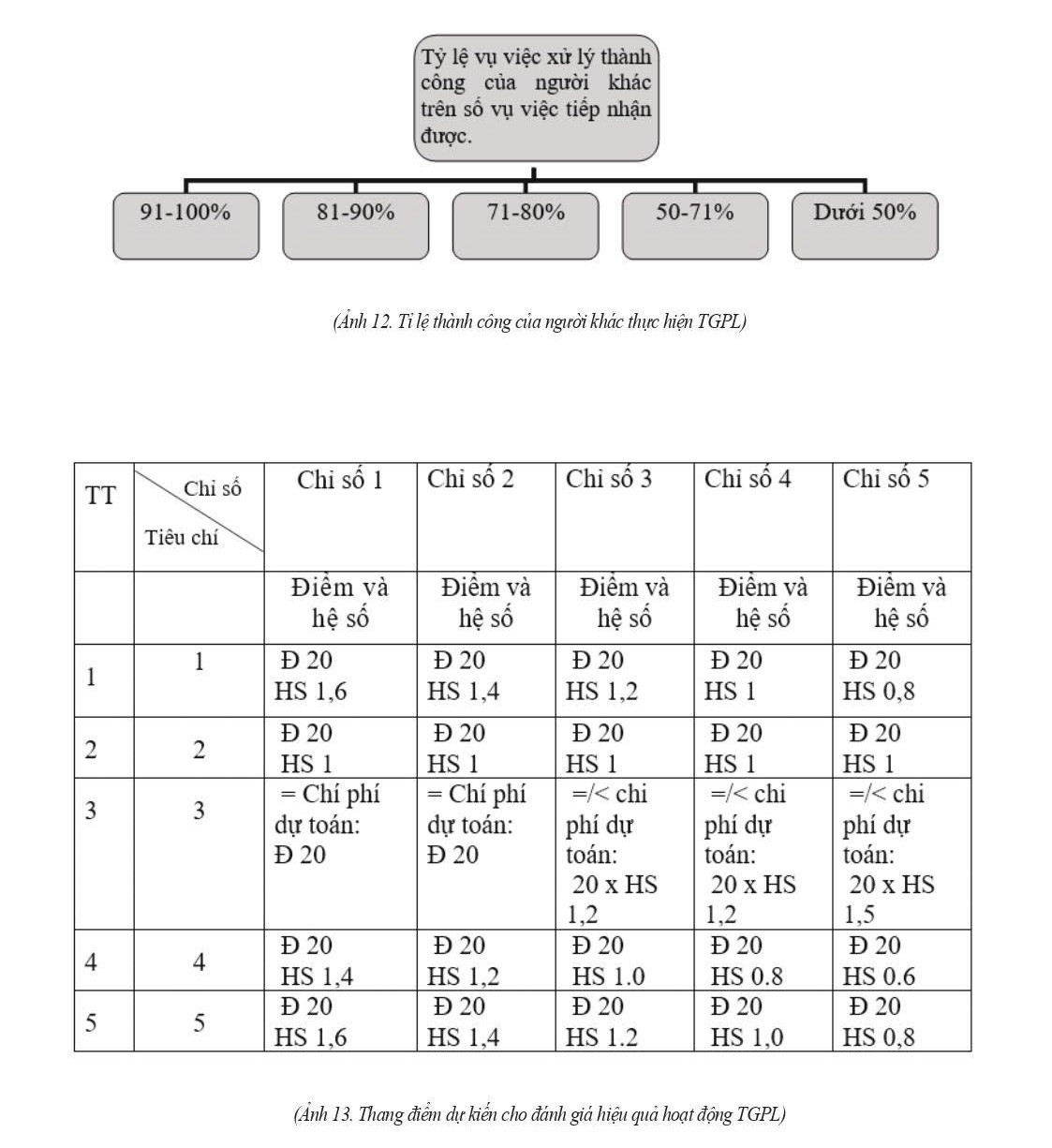 - Tiêu chí số 02 và chỉ số. Các vụ việc thành công là bằng chứng thuyết phục và có căn cứ nhất để đánh giá hiệu quả của hoạt động TGPL. Đây là chỉ số thể hiện khái quát nhất hiệu quả hoạt động TGPL, cũng như các hoạt động xã hội khác, như hoạt động bào chữa, hoạt động xét xử của Tòa án, trọng tài hay hoạt động hòa giải (xem ảnh 9 trang 14).