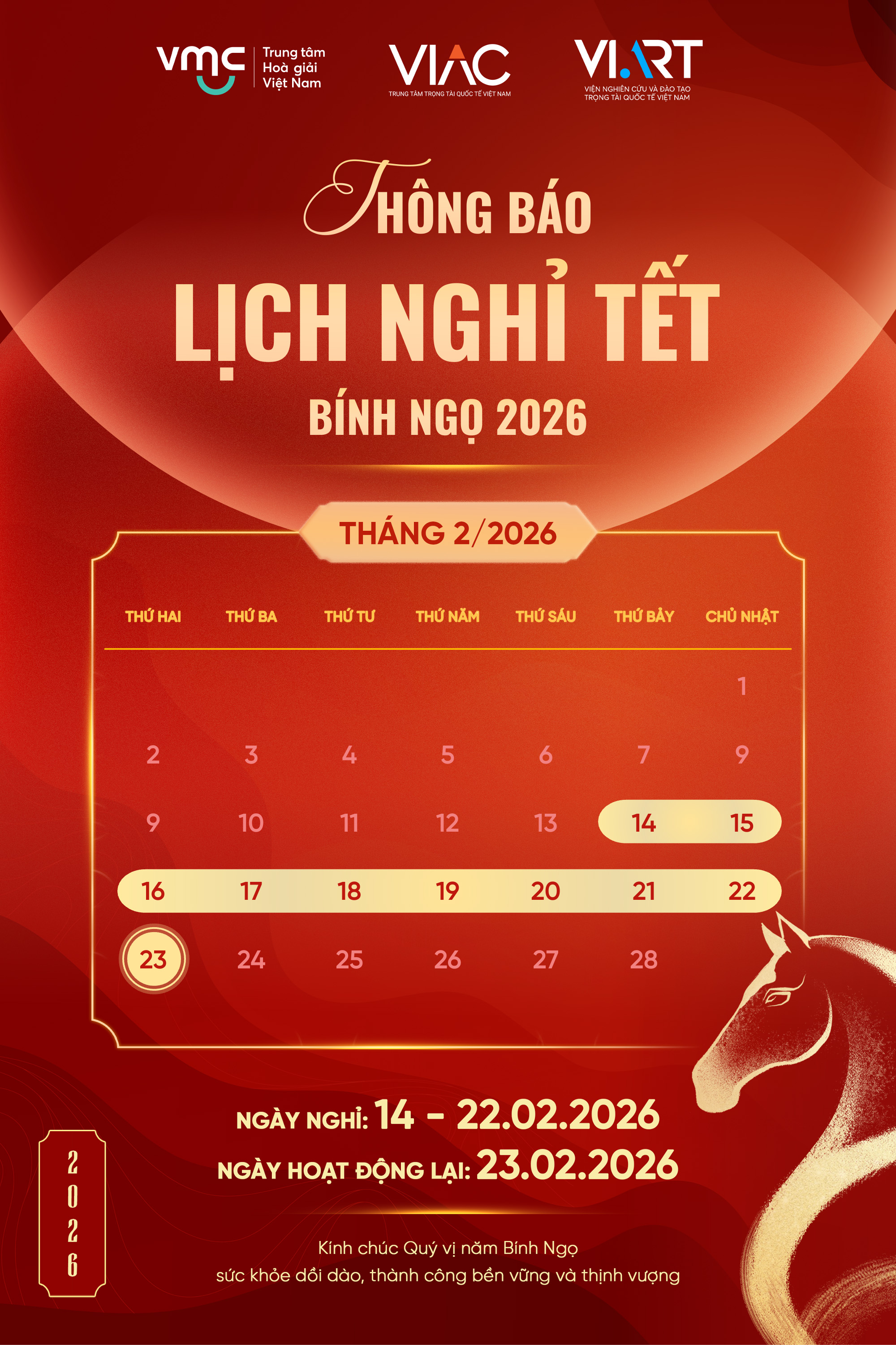 Trung tâm Trọng tài Quốc tế Việt Nam (VIAC) xin trân trọng thông báo lịch nghỉ lễ Tết Nguyên Đán Bính Ngọ 2026 như sau: