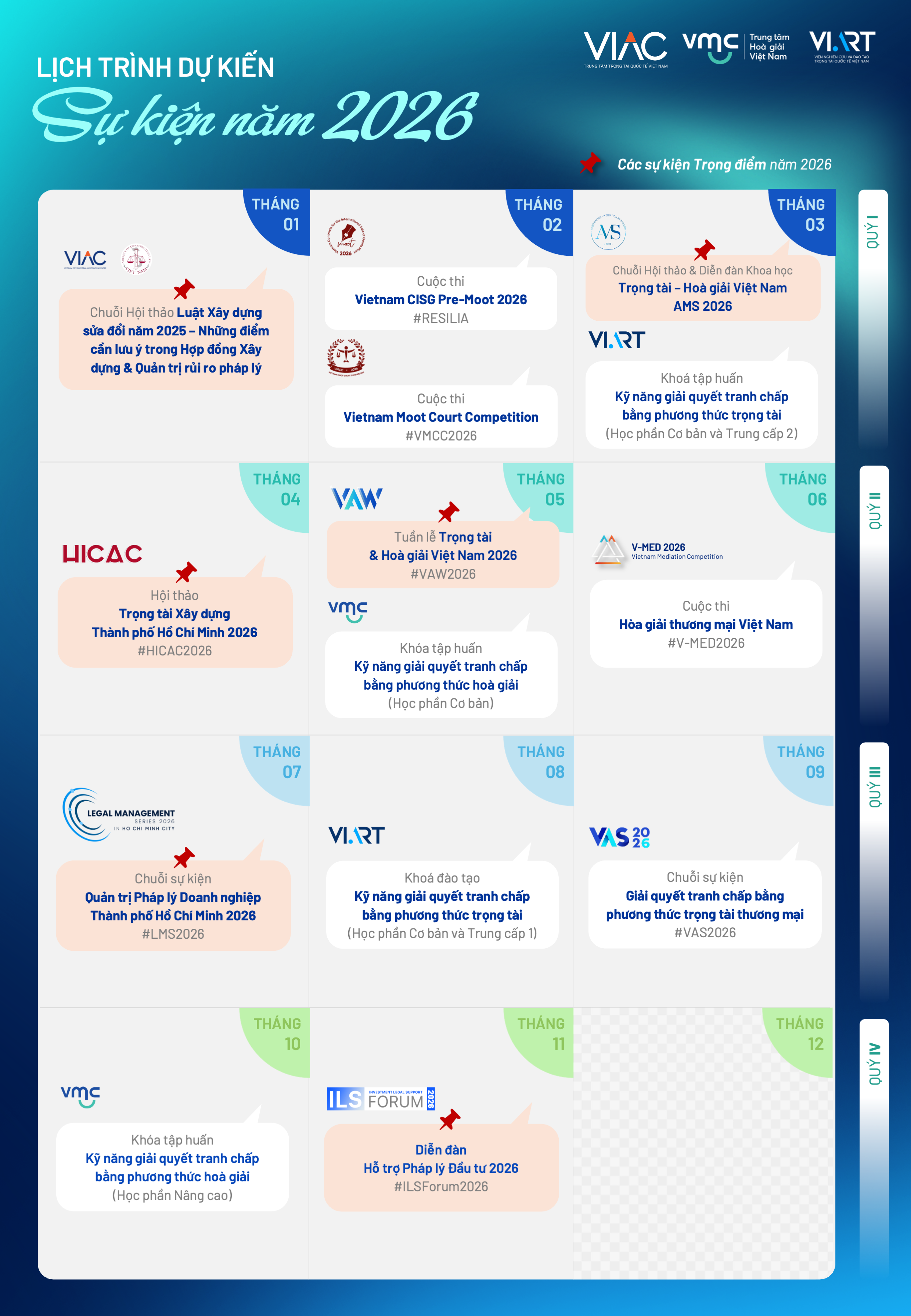 Bước sang năm 2026, VIAC sẽ tiếp tục triển khai đa dạng các hoạt động trong nước và quốc tế nhằm thúc đẩy phương thức giải quyết tranh chấp bằng trọng tài, hòa giải và các phương thức ADR khác theo hướng thân thiện, công bằng và hiệu quả; góp phần nâng cao năng lực cạnh tranh của doanh nghiệp, hỗ trợ các hoạt động kinh tế – thương mại – đầu tư và tăng cường hợp tác giữa các tổ chức, cá nhân trong nước cũng như giữa Việt Nam với quốc tế. VIAC tin rằng, bằng sức mạnh của tri thức và sự hợp lực, các hoạt động trong năm 2026 sẽ tiếp tục tạo nên những dấu ấn mới, lan tỏa giá trị và mang đến nhiều lợi ích thiết thực cho cộng đồng.