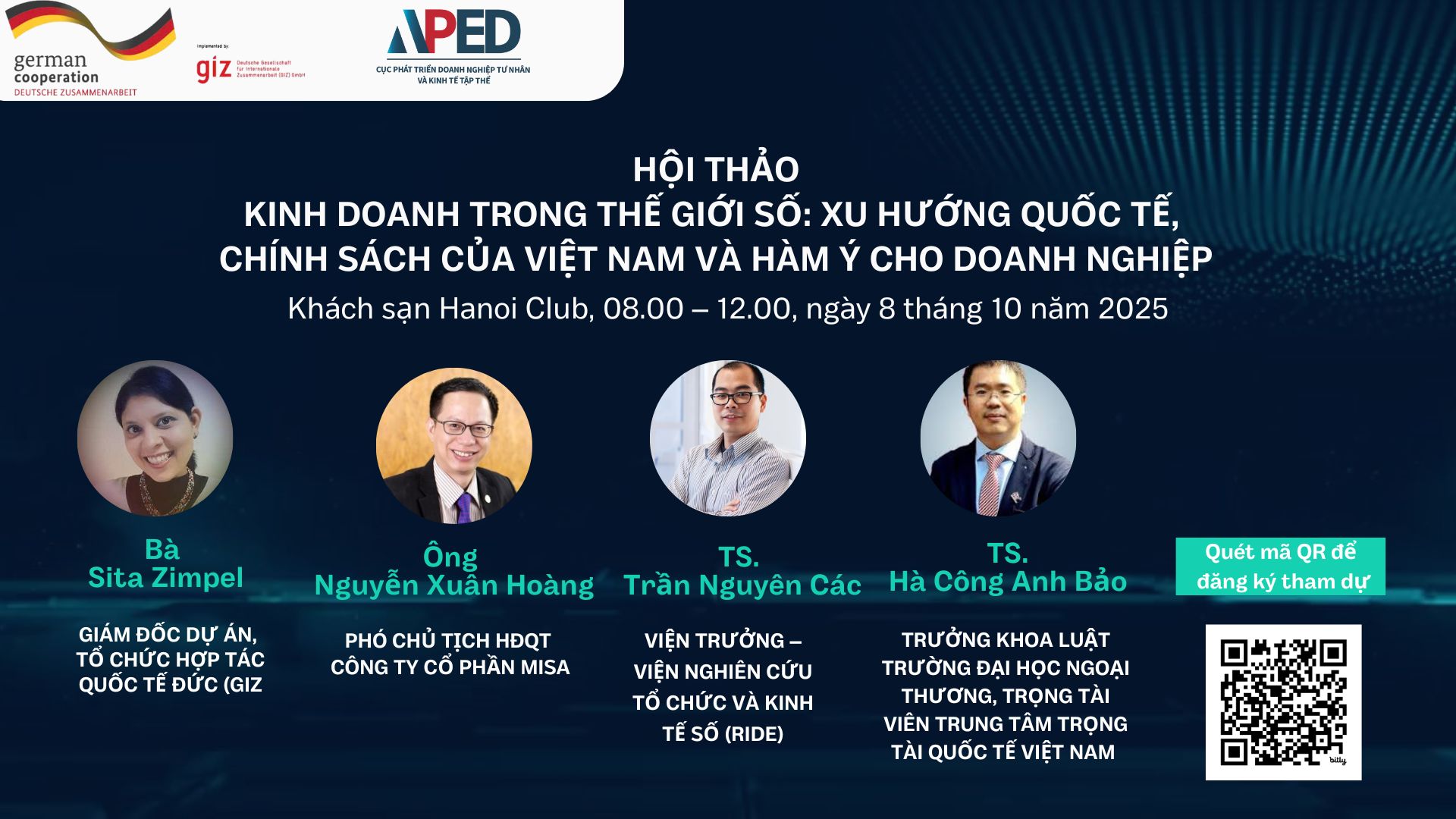 Nhằm hỗ trợ doanh nghiệp Việt Nam chuyển đổi số và xây dựng những chiến lược về kinh doanh có trách nhiệm trên môi trường số, đảm bảo phù hợp với xu hướng quốc tế, tuân thủ chính sách pháp luật của Việt Nam, đồng thời hướng tới ngày Chuyển đổi số quốc gia 10-10, trong khuôn khổ Dự án “Hỗ trợ phát triển Doanh nghiệp nhỏ và vừa trong ASEAN thực hiện tại Việt Nam giai đoạn II”, Cục Phát triển doanh nghiệp tư nhân và Kinh tế tập thể phối hợp với GIZ tổ chức Hội thảo “Kinh doanh trong thế giới số - Xu hướng quốc tế, chính sách của Việt Nam và hàm ý cho doanh nghiệp”, cụ thể: