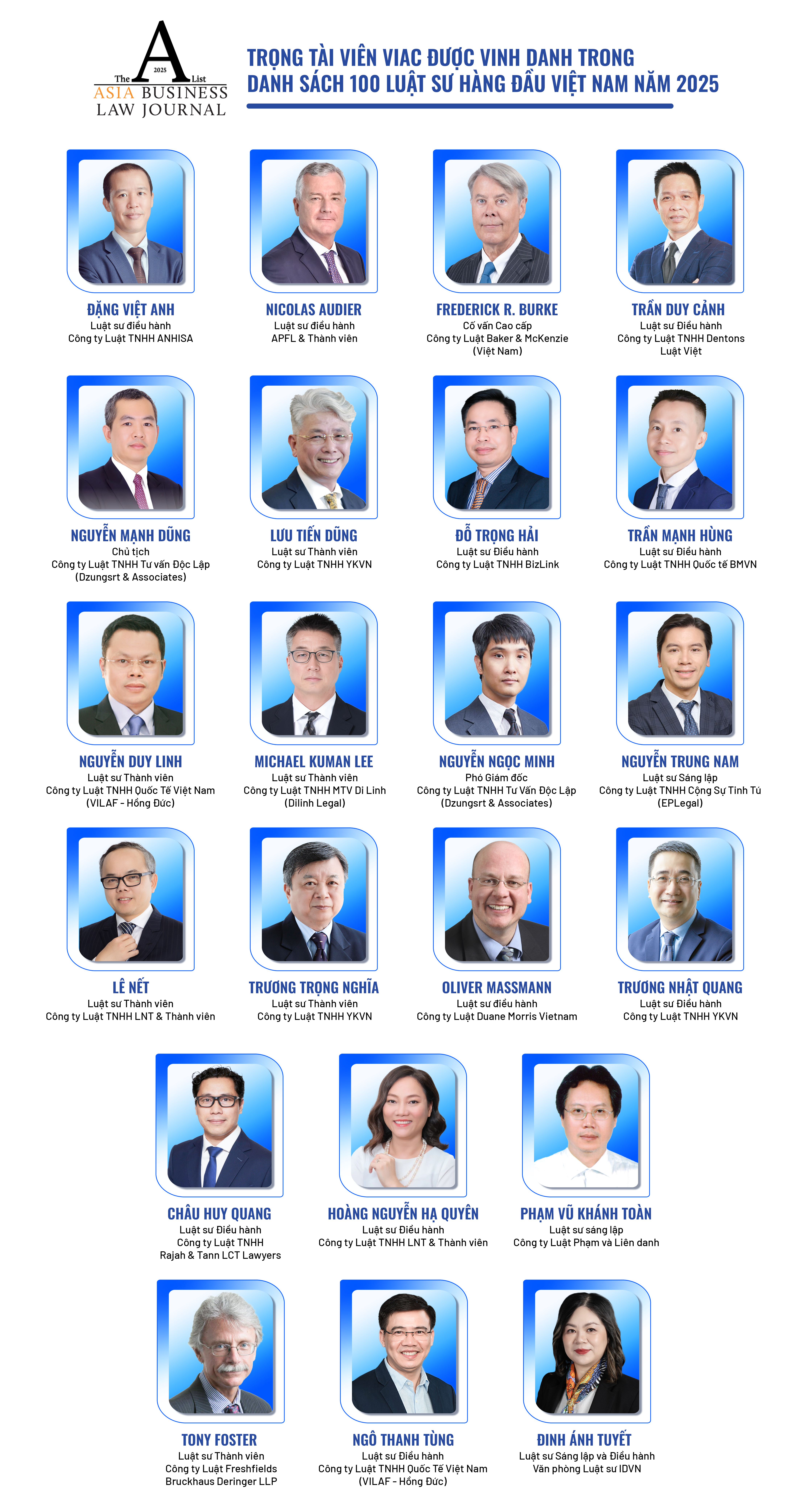 Trong đó, có 22 luật sư trong danh sách là Trọng tài viên Trung tâm Trọng tài Quốc tế Việt Nam (VIAC), bao gồm: