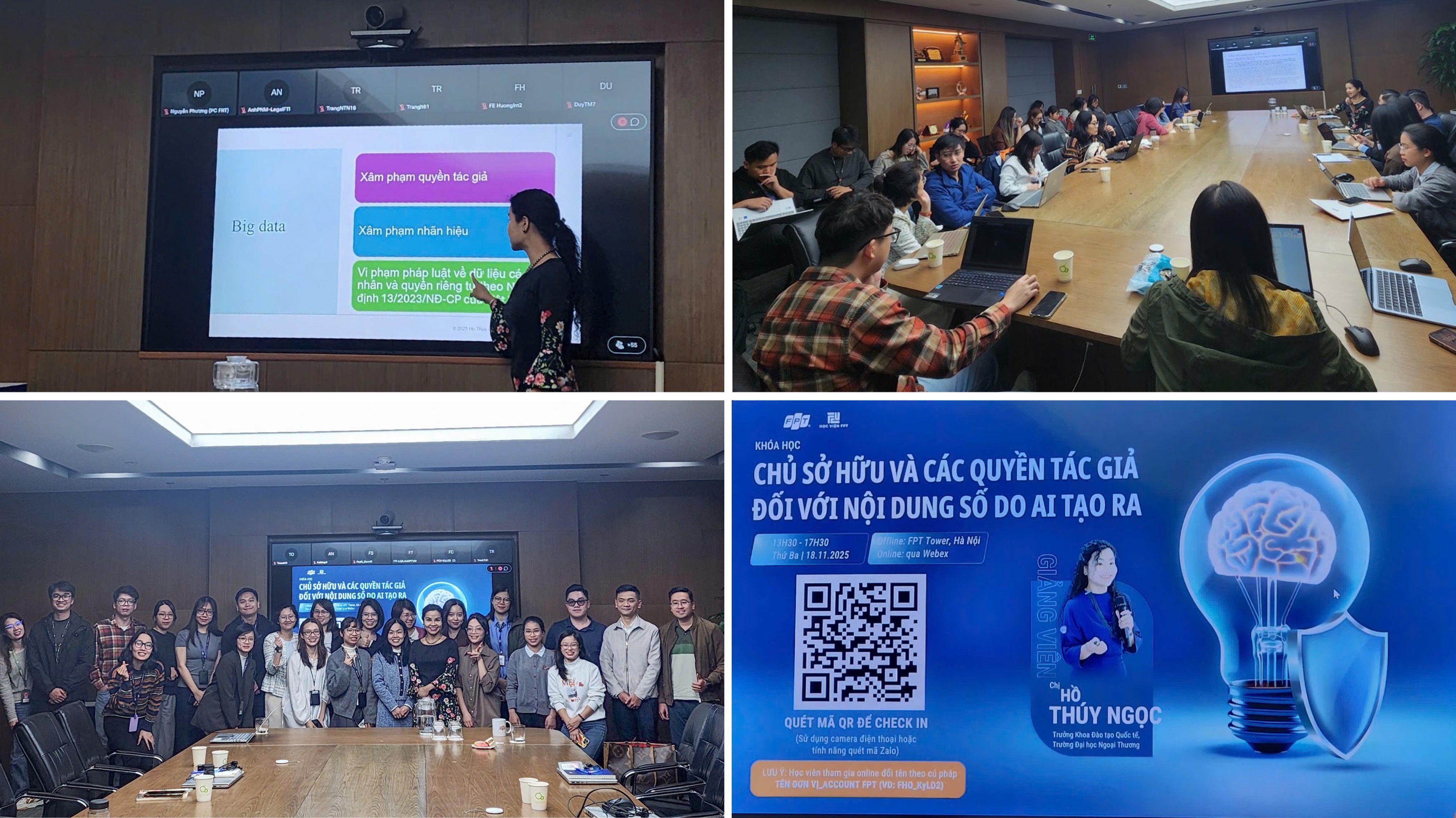 Chiều thứ Ba ngày 18/11/2025 vừa qua, Trung tâm Trọng tại Quốc tế Việt Nam (VIAC) đã phối hợp với Công ty Cổ phần Viễn thông FPT tổ chức thành công buổi tập huấn với chủ đề về chủ sở hữu và các quyền tác giả đối với nội dung số do AI tạo ra. Về phía VIAC, có sự tham gia giảng dạy của PGS. TS. Hồ Thúy Ngọc, Trưởng khoa Đào tạo quốc tế trường Đại học Ngoại Thương, Trọng tài viên VIAC. Buổi đào tạo diễn ra trong không khí sôi nổi, với nhiều câu hỏi và tình huống thực tiễn được đưa ra từ phía cán bộ, chuyên viên của FPT Telecom – những người đang trực tiếp làm việc với các nền tảng số, hệ thống AI và dữ liệu lớn mỗi ngày.